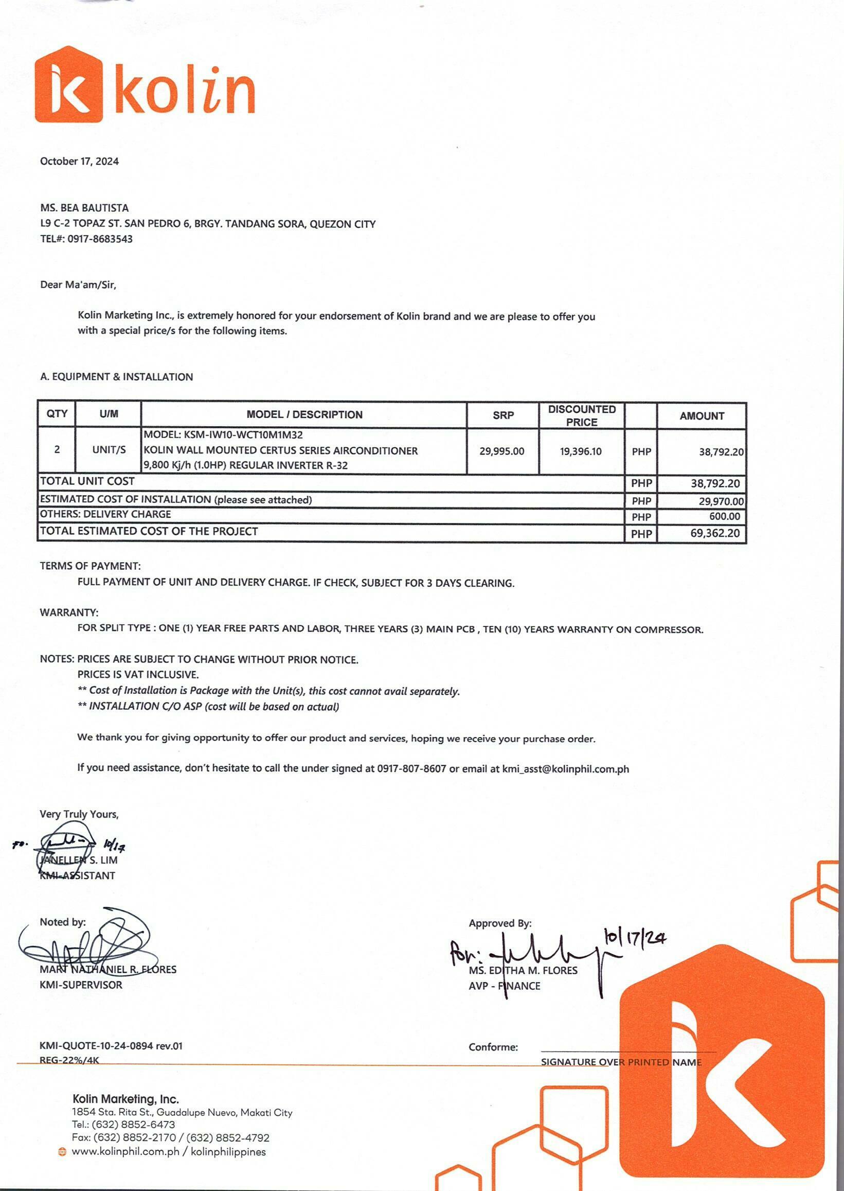 4/2/2025 2:36 PM 66170 _QUOTATION FOR_INSTALLATION_OF1HP KOLIN CERTUS MODEL2 .pdf